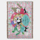 Beautiful Christmas holiday throw blanket features three adorable penguins in ice skates, sweaters, striped scarves, and winter hats on a background of white with colourful text that reads Happy Holidays and Seasons Greetings, a solid pink area with white snowflakes, and a white centre with snowflakes on orbs. You can easily personalise with your family name!