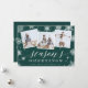 Elegant holiday photo card features three square photos in a collage layout, with "Season's Greetings" in white script and block lettering on a hunter green background dotted with snowflakes. Personalise with your name(s) and the year beneath.
