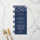 Coastal chic wedding menu in classic navy blue features your starter courses, entrees and desserts in white lettering, with your names and wedding date topped by a white nautical rope illustration. Coordinates with our Seaworthy collection for nautical, beach or summer weddings and celebrations.