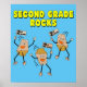 Second grade rocks text with three happy rocks holding 2nd grade flags is a funny education gift design for parents, elementary school teachers and students.