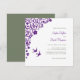 Woodland, secret garden purple floral wedding invitation design with lovebirds. Detailed floral pattern corner in thistle purple. Customise with your names in thistle purple script and your wedding information in dark sage lettering.