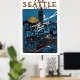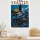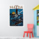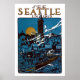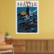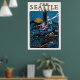 A vintage poster promoting travel to Seattle, Washington during the year 1915. Handsome view of Seattle's port and architecture as seen at night with a full moon rising in the background.