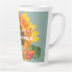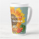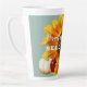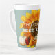 Sunflower and vegetables, custom tall latte mug for the gardener. Personalise with a name, or use the sample wording which is, "Professional seed saver". Grey-green background colour with a large orange and yellow sunflower. A border of vegetables, that includes a pumpkin, tomatoes, corn, peppers and cabbage, is across the bottom. This design also fits on the smaller cup.