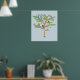 A seed grows into a tree in this fun nature poster. Illustration is done in a folk art type of style. Leaves of a variety of green shades. Lots of animals are hanging out in (or around) the tree: blue jay, male and female cardinals, robin, owl, pileated woodpecker, snake, two squirrels, butterflies, sleeping bat, bees, lady bugs, iguana, caterpillars, and one well-hidden tree frog with red eyes. A cool nature poster.