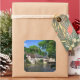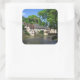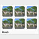 Square souvenir photo sticker of the castle and the quaint historic village of Ségur-le-Château with its half-timbered houses alongside Auvézère river in Limousin, France.