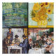 Various impressionist masterpieces: Paul Cezanne - The Card Players, Pierre-Auguste Renoir - Luncheon of Boating Party, Vincent Van Gogh - Vase with Fifteen Sunflowers, Claude Monet - Water Lily pond, Green Harmony