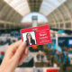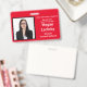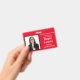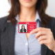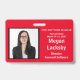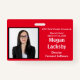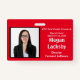 Horizontal Seminar Attendee badge in Red and White. All elements can be changed, including: photo, seminar name, seminar location & date, attendee's name, attendee's title and the name of the company. Horizontal orientation. Slot at top for a lanyard. Also available in vertical orientation in this store.