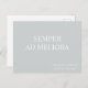 A motivational postcard featuring the Latin phrase ‘semper ad meliora’. A popular phrase in Ancient Rome, the translation is ‘always towards better things’. It reminds us to focus on moving forward towards greater things without looking back. The typographic postcard features crisp white text on a grey background.The lettering has a classical feel evoking Roman public inscriptions and the English translation is in a contrasting font.