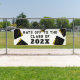 Unique graduation congratulations banner featuring black and gold graduation caps. Edit text to change class year.