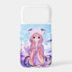 Step into a vibrant, ethereal world with this stunning anime-style portrait. Featuring a character with long pink hair and a white cat-eared hoodie, she stands against a breathtaking purple and blue sunset city skyline. The painterly style and soft lighting create a high-emotional impact, perfect for fans of dreamcore and modern