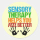 Funny occupational therapist sticker that says Sensory Therapy Helps You Feel Better in fun, bright colours of blue, green, orange and red. A set of handprints are underneath symbolising the benefits that children get from exercises such as finger painting and playing.