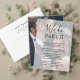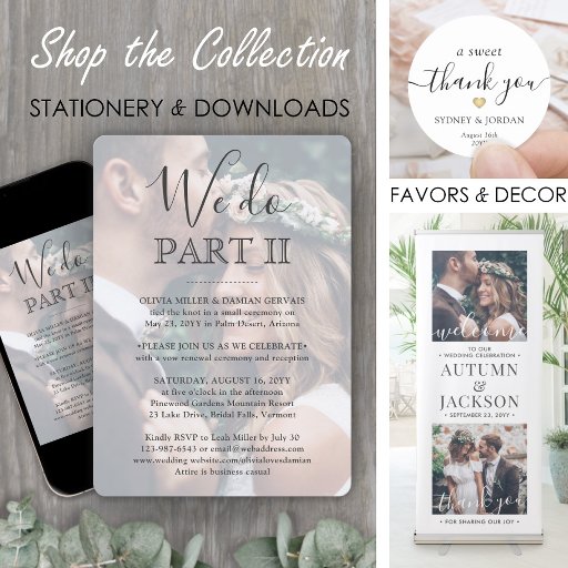 Announce the joyful news of your wedding and upcoming celebration with unique custom photo overlay save the date invitations. Family and friends can witness you say "I do" again at a stylish sequel wedding with a vow renewal ceremony and reception. The two photos and all wording are simple to personalise including quote that reads "we do part II." Customise it for any type of marriage celebration, such as a 1st anniversary reception, post elopement party, cocktail hour or dinner party. Include the marriage date, location, website, or any other important details of your choice. (IMAGE PLACEMENT TIP: An easy way to centre a photo exactly how you want is to crop it before uploading to the Zazzle website.) The modern minimalist black and white design features 2 pictures of the newlywed couple, trendy handwritten script calligraphy, and elegant typewriter style typography. Whether or not you eloped due to the covid pandemic or downsized to a smaller, more intimate minimony or micro wedding, the happily ever after party can still get started. Congratulations to the bride and groom!