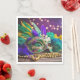 Mardi Gras sequin mask with gold necklace, feathers, and bokeh lights