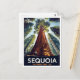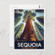 Capture the awe-inspiring scale of Sequoia National Park, California, with this dramatic retro travel postcard. The design showcases the colossal height of the ancient Giant Sequoia trees towering toward the sky, minimizing the hiker beneath to emphasize their immense size. This artwork perfectly conveys the grandeur and majesty of this California natural landmark, making it an excellent piece for nature lovers and collectors of US National Park posters.