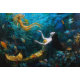 “Seraphina” – Beautiful Mystical Mermaid. Aquatic Dreamscape: In this serene surreal underwater setting, a beautiful mermaid with a highly decorated golden fishtail lies on the seabed, her flowing hair drifting in the current of a stunning blue sea. The surrounding sea creatures, including an inquisitive humanlike octopus and vibrant fish, add life to the scene. The Pre-Raphaelite style's subtle multi-coloured tones and intricate details make this a captivating and restful picture.