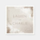 This wedding napkin design features a minimalist and elegant layout with a soft, neutral colour palette of beige and cream. The abstract watercolor background creates a dreamy, ethereal atmosphere, while the clean, sans-serif typography adds sophistication. Perfect for formal occasions like weddings or engagements, this design conveys a serene and romantic mood, making it ideal for celebrating love and commitment.