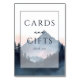 This wedding tabletop sign features a serene nature-inspired design with soft pastel colors, including light blue, pale pink, and gray. The layout is vertically oriented, showcasing a stylized mountain landscape with silhouettes of pine trees, creating a tranquil and ethereal atmosphere. Elegant typography highlights the words "CARDS and GIFTS" in bold serif font, complemented by a cursive "and," while "thank you" is written in smaller italicized letters, emphasizing gratitude. The semi-abstract representation style blends modern minimalism with natural elements, making it perfect for expressing heartfelt appreciation at your special event.
