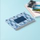 This wedding guest book features a serene wintery forest theme with stylised evergreen trees in various shades of blue, creating a frosty atmosphere. The design includes a centred navy-blue rectangle with elegant serif typography for names and date, adding a formal touch to the modern layout. The cool colour palette and clean lines evoke a sense of calmness and celebration, making it perfect for capturing memories at a winter-themed wedding.