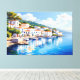 An exquisite oil painting depicting a tranquil Mediterranean coastal village. The scene showcases whitewashed buildings with warm orange terracotta rooftops, nestled among vibrant green trees and shrubs. Below, calm azure waters reflect the picturesque surroundings, with small fishing boats gently docked, adding charm to the peaceful harbour. The sky is adorned with soft white clouds, illuminated by sunlight, while seagulls soar gracefully above. The bold, textured brushstrokes and rich palette of blues, whites, and earth tones bring the lively yet serene atmosphere to life, evoking the essence of a peaceful seaside retreat.