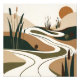 This minimalist abstract artwork features a winding river flowing through a serene desert landscape, accented by vibrant reeds and a warm sunset. The earthy tones and simple lines create a calming and timeless piece that will add a touch of nature to any space.