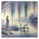 A dreamlike scene unfolds in this serene landscape art, where a mystical woman in flowing robes stands beneath a weeping willow, gazing over a tranquil lake at dawn. This Asian fantasy artwork is rich with calm atmosphere and intricate storytelling, drawing viewers into a soft, ethereal world. The willow tree illustration cascades into the frame, its delicate leaves enhancing the peaceful nature scene. A solitary heron perches quietly on a wooden dock, mirroring the stillness of the water. Gentle pastels in shades of lavender, misty blue, and pale gold evoke a sense of poetic stillness, ideal for anyone drawn to spiritual solitude or fantasy serenity. A lantern-lit pavilion and drifting boat in the background add subtle narrative layers to this tranquil lake scene. Perfect as a calming visual for meditation spaces or dream-inspired decor. AI generated artwork.