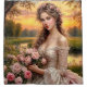 This image depicts a woman in an elegant, off-the-shoulder gown adorned with intricate lace details. She holds a bouquet of delicate pink roses and stands amidst a picturesque garden at sunset. The background features a serene landscape with trees, flowers, and a tranquil pond, creating a peaceful and romantic atmosphere. This composition is perfect for a wall art piece that captures the essence of elegance and tranquility.
