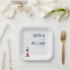 This wedding plate features a minimalist design with a clean white background, showcasing the names "SOPHIA and WILLIAM" in bold sans-serif typography paired with elegant cursive for "and." A charming lighthouse illustration adds a nautical touch to the composition. The color palette includes soft grays, vibrant reds, whites, and muted greens, creating a serene and sophisticated mood perfect for celebrating your special day.
