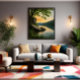 By the lake, where rocks rest and trees frame the view, the sky painted in golden and bluish tones meets its reflection in the calm water. An artwork that conveys peace, connection with nature, and the untouched beauty of sunset.