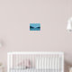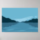 A poster with a minimalist landscape illustration of serene lake with mountains in gradients of blue tones: perfect wall art for office or home decoration.