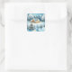Christmas stickers or Christmas card seals. Pretty festive log cabin lit up with Christmas lights with a background of beautiful snow covered trees.