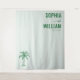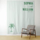 This wedding backdrop features a minimalist design with a soft mint green background, creating an elegant and serene atmosphere. The layout includes bold serif typography in deep forest green for the names "SOPHIA" and "WILLIAM," accompanied by a date below, all centred at the top. A detailed palm tree illustration adds a subtle tropical touch to the bottom left corner. The clean composition and modern aesthetic make it perfect for contemporary weddings, blending formality with relaxed charm.