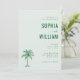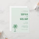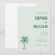This elegant wedding invitation features a minimalist design with a soft mint green background, creating a serene and sophisticated atmosphere. The layout is clean and balanced, showcasing the names in bold uppercase letters with a decorative line separating them, complemented by a simple palm tree illustration that adds a tropical touch. The typography combines serif and script fonts for visual interest, while ample negative space ensures clarity and an uncluttered look. Perfect for couples seeking a chic and modern aesthetic for their special day.