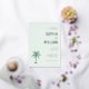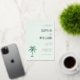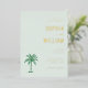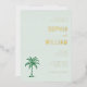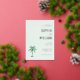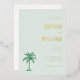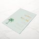 This elegant wedding invitation features a soft mint green background with gold script and serif typography, creating a luxurious yet serene atmosphere. A single palm tree illustration adds a tropical touch to the minimalistic design, which is perfect for beach or summer weddings. The layout is clean and spacious, ensuring all important details are highlighted without overwhelming the eye. Customisable text allows you to personalise the invitation effortlessly, making it ideal for couples seeking a sophisticated and inviting aesthetic for their special day.