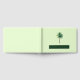 This wedding guest book features a minimalist design with a central palm tree illustration on a soft mint green background, evoking a serene tropical atmosphere. The layout is balanced and airy, with ample negative space that highlights the stylized palm tree. A deep forest green banner below holds customizable text in elegant serif and sans-serif fonts, adding a touch of formality. Perfect for beach-themed weddings, this design combines simplicity and elegance to create an inviting and tranquil mood.