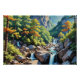 This stunning image captures a serene mountain landscape featuring a cascading waterfall flowing through a rocky terrain. The lush green forest, dotted with trees displaying autumn hues, creates a vibrant contrast against the clear blue sky. The scene is framed by majestic mountains in the background, adding depth and grandeur to the composition. This picturesque setting is perfect for nature enthusiasts and those seeking tranquillity and inspiration from the great outdoors.
