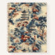 This artwork depicts an idyllic scene of traditional Asian pagodas nestled among vibrant trees and misty mountains. The colour palette blends soft blues, rich oranges, and creams, giving the image a tranquil, dreamlike quality. Flowing waterfalls and delicate foliage add to the serenity, evoking a sense of harmony with nature.