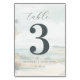 This wedding table card features a serene beach scene with soft watercolor textures, creating an impressionistic landscape of pastel blues, greens, and sandy beiges. The design includes a large numeral "3" in bold dark grey, complemented by elegant cursive and simple sans-serif typography for a sophisticated look. Palm trees and wispy clouds add to the tropical ambiance, while ample negative space ensures clarity and focus on the central elements. Perfect for weddings or formal gatherings, this card combines aesthetic appeal with functional elegance, setting a peaceful and inviting tone.
