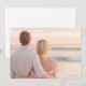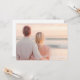 This wedding invitation features a serene beach scene with two individuals standing close together, facing the ocean at sunset. The design uses a soft pastel color palette of peach, pink, and light blue to create a tranquil and romantic atmosphere. The composition captures the couple from behind, emphasizing their closeness against the expansive horizon and gentle waves. The photographic art technique highlights natural lighting and subtle details, evoking feelings of serenity and love. Perfect for couples seeking an elegant and intimate theme, this invitation sets the tone for a peaceful celebration by the sea.