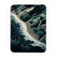 Serene Shores: This stunning top-down illustration captures the harmony of land and sea, featuring waves gently breaking on sandy beaches with lush green mountains in the background. Rendered in soothing shades of dark blue-green, the artwork evokes a sense of tranquility and balance. The intricate detail of the ocean’s patterns meeting the shore, paired with the trees lining the water’s edge, enhances the peaceful atmosphere. Created in a woodcut print style with simple lines and a flat design, the piece is reminiscent of hand-drawn animation, offering a timeless, serene depiction of nature’s beauty.