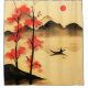 This artwork captures a peaceful dawn where soft golden light illuminates misty mountains and calm waters. Vibrant red foliage contrasts gracefully with the silhouettes of slender trees, creating a dreamy autumn atmosphere. A lone boatman glides gently across the tranquil lake, adding a sense of solitude and reflection. The rising sun and distant birds complete the scene, evoking harmony, balance, and natural beauty.