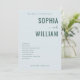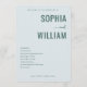 This wedding program features a minimalist and elegant design with a soft, pastel teal background that creates a serene atmosphere. The layout is clean and structured, utilizing a mix of bold serif fonts for the names "Sophia" and "William," and a cursive script for the word "and," adding a touch of sophistication. A simple sans-serif font lists the ceremony schedule, ensuring readability while maintaining a modern aesthetic. Customizable date and location details at the bottom allow personalization, making this template perfect for couples seeking a timeless and classic look for their special day.