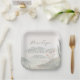 These elegant paper plates feature a serene watercolor landscape with soft, muted tones of blue-grey and greenish-blue mountains in the background, complemented by earthy browns and delicate pink flowers in the foreground. The design captures a romantic, dreamlike atmosphere, perfect for creating a tranquil and sophisticated setting. With graceful typography at the centre, these plates are ideal for weddings or special occasions, offering customisable options to add personal touches while maintaining an inviting and refined aesthetic.