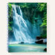 Journal in an illustration of a cascading waterfall in pale blue with white spray, surrounded by boulders and green leaves