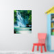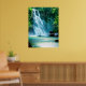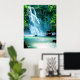 Poster in an illustration of a cascading waterfall in pale blue with white spray, surrounded by boulders and green leaves