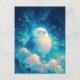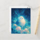 This enchanting postcard features a blissful, fluffy white owl nestled peacefully among swirling, dreamlike clouds. The illustration is rendered in a vibrant watercolor style, utilizing a deep and refreshing palette of indigo, turquoise, and soft cream. Shimmering stars and glowing light orbs float through the atmospheric sky, while stylized cloud wisps create a sense of ethereal movement and cosmic wonder. With its serene vibe and luminous highlights, this piece captures a moment of pure celestial tranquility. It is a perfect choice for sending a "thinking of you" message, a peaceful birthday greeting, or a magical note to any bird lover.