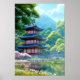 In the midst of lush nature, a white-walled Japanese pagoda stands tall, beckoning to those seeking peace and tranquillity. A calm river flows by its side, adorned with banks of vibrant yellow and white flowers that sway gently with the wind. The green forest forms a serene backdrop to this idyllic setting, as if standing guard over the pagoda's serenity. As you gaze upon this digital artwork, you can almost feel the calmness wash over you, transporting you to a world of pure bliss.
