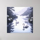 This soft-toned landscape depicts a tranquil lake surrounded by misty mountains and forests, with swans gliding gracefully. The calm water reflections and delicate flowers create a scene of peace and natural beauty, a serene retreat in untouched nature.
