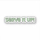 A fun typography design with the words "Serve it Up!" in a green retro font. This design makes a great gift idea for pickleball players!