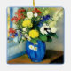 Serene Flower Vase Artwork. Enhance your space with this serene stylised watercolour still life vase of flowers. Delicate blues, yellows, and reds add a calming touch to any room.