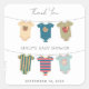 Baby shower thank you featuring illustration of baby bodysuits representing Sesame Pals Big Bird, Cookie Monster, Oscar the Grouch, Bert, Ernie, and Abby Cadabby.